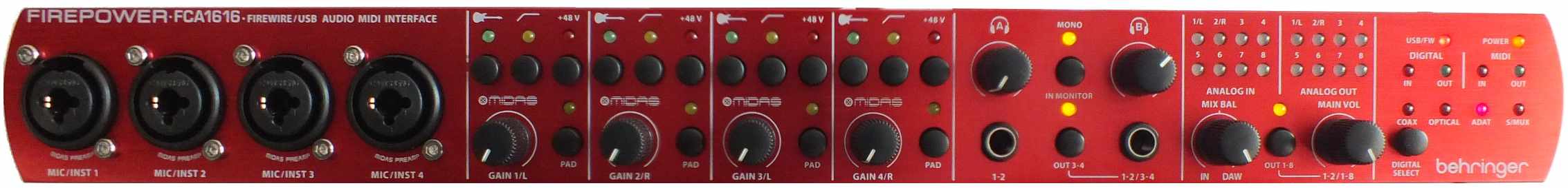 - "MIDAS-preamp design" means, "Music Group" where Uli Behringer is CEO acquired the company MIDAS and they took the preamp design and integrated it into the FCA1616 in some way.