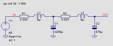 Ein Filter bestehend aus 2 Spulen jeweils 6 uH mit einem Serienwiderstand von jeweils 30 mOhm, zwei Widerständen, zwei Elkos, einmal 2200 uF bis 50 V und 470 uF bis 100 V bilden ein zweistufiges LCR-Glied. Die Bauelemente sind so gewählt, weil es eine der wenigen Elkos waren, die eine höhere Spannung als 48 V aufweisen und diese in der Schublade meines Heimlabors lagen. Das gleiche gilt für die Spulen. Die Elkos sollten mindestens 48 V vertragen, da diese Schaltung für die Filterung der Phantomspannung eines Mischpultes verwendet wird (PhantomspannungMM122 Projektseite). Funktioniert mit diesem Filter wunderbar!